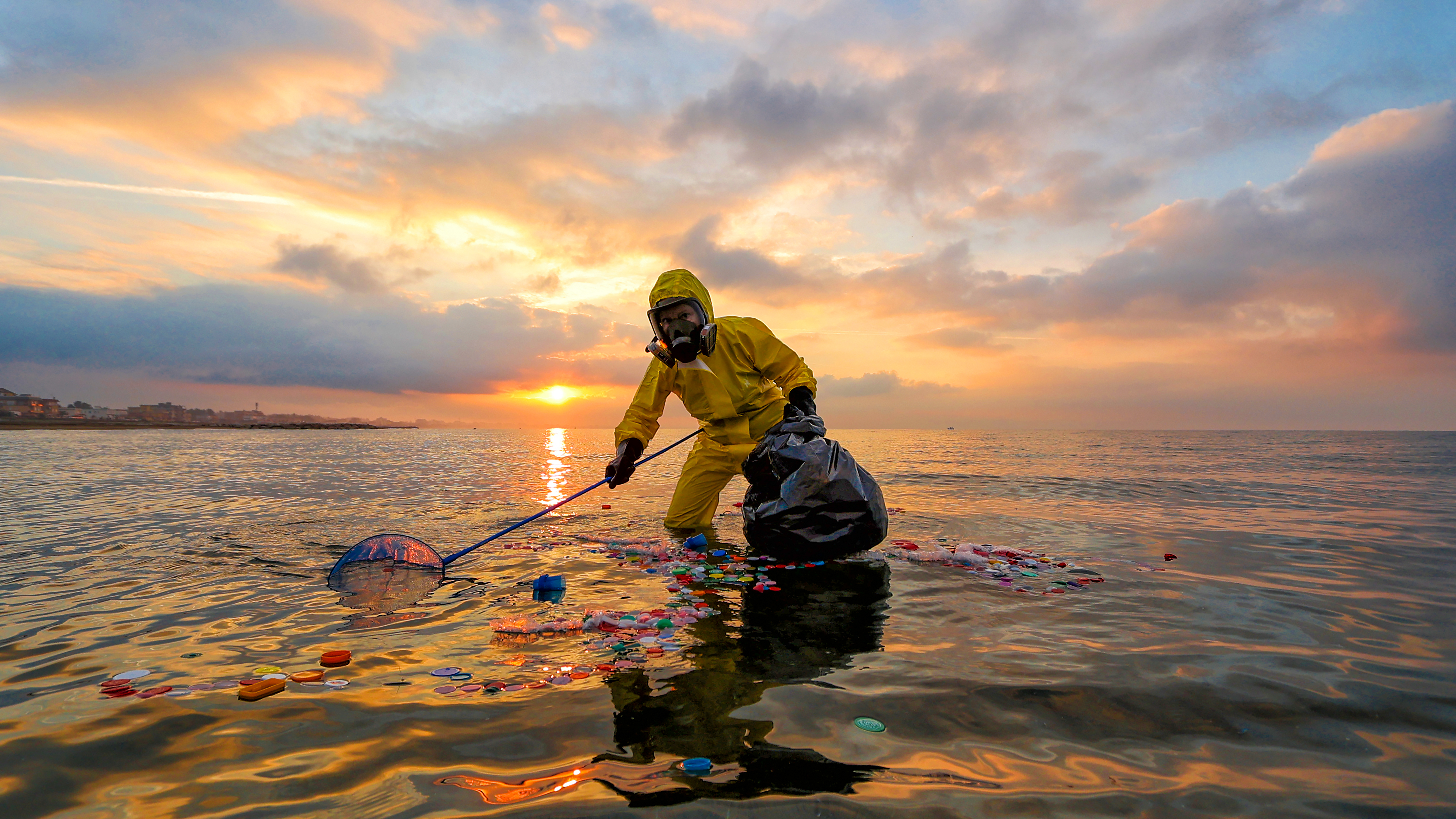 A nameless woman is dressed in plastic and aluminium paper to cover herself in a rainy day. People's eyes are captured by the woman figure and the pigeon in front of them flies away unnoticed.